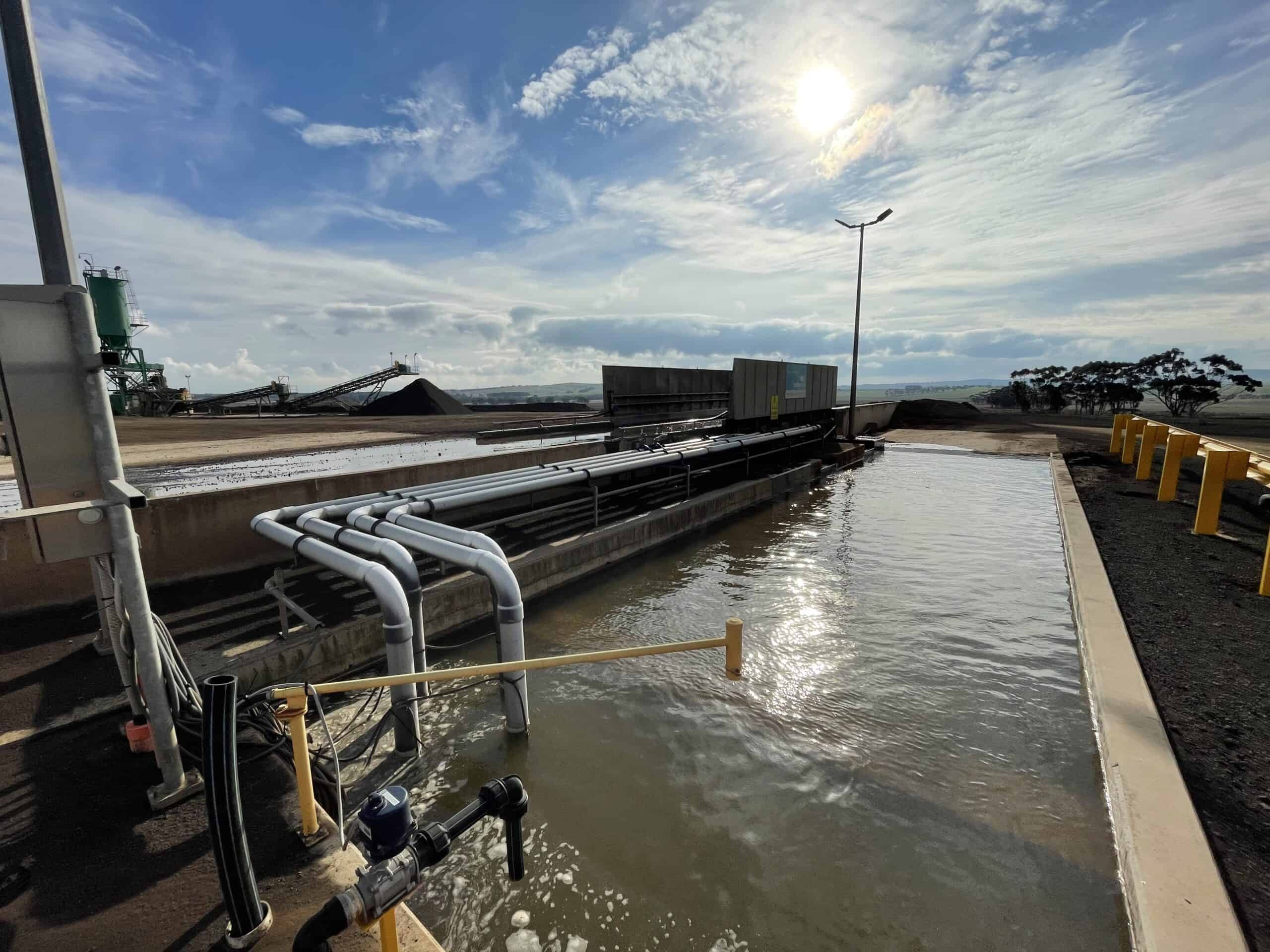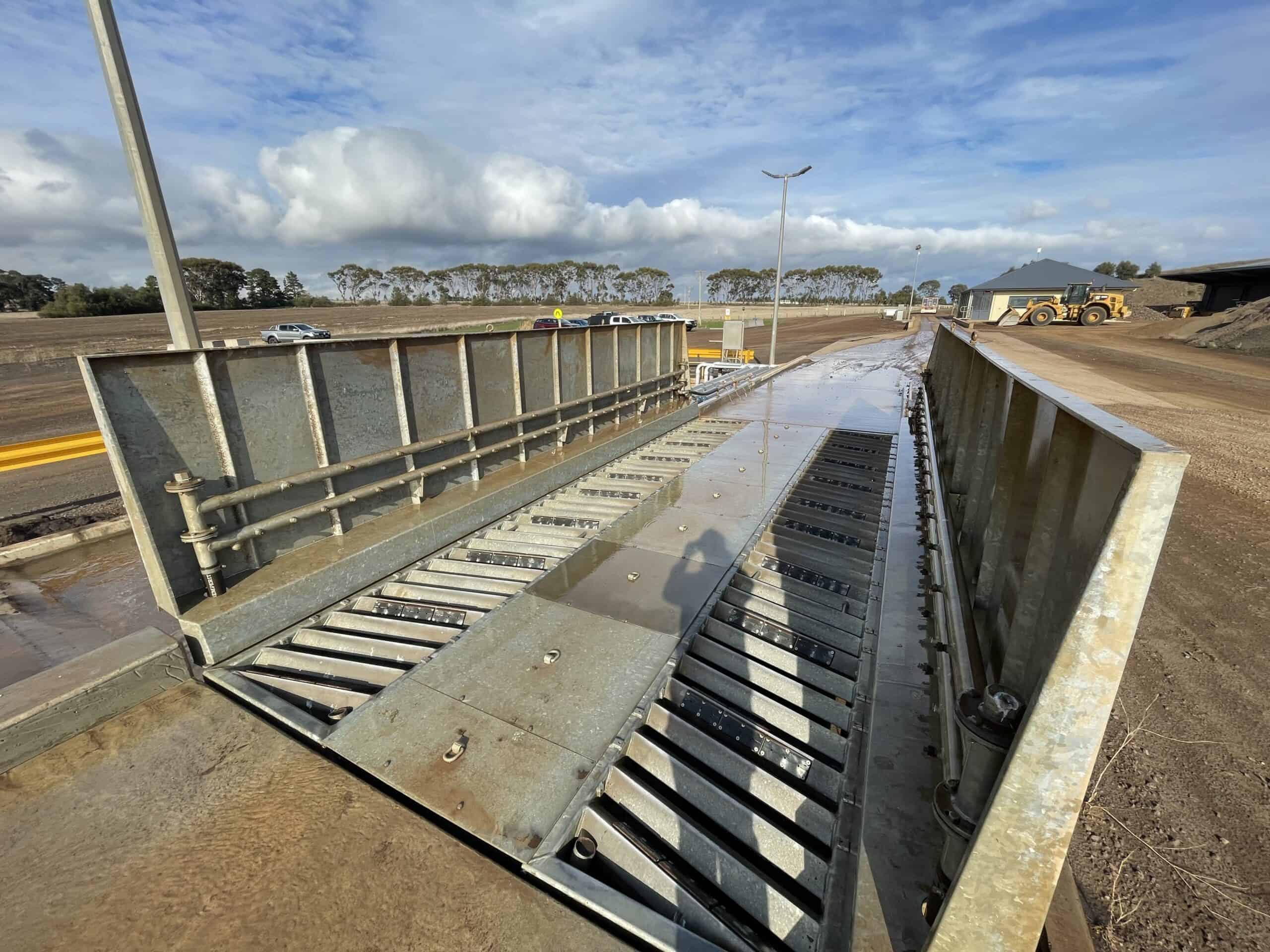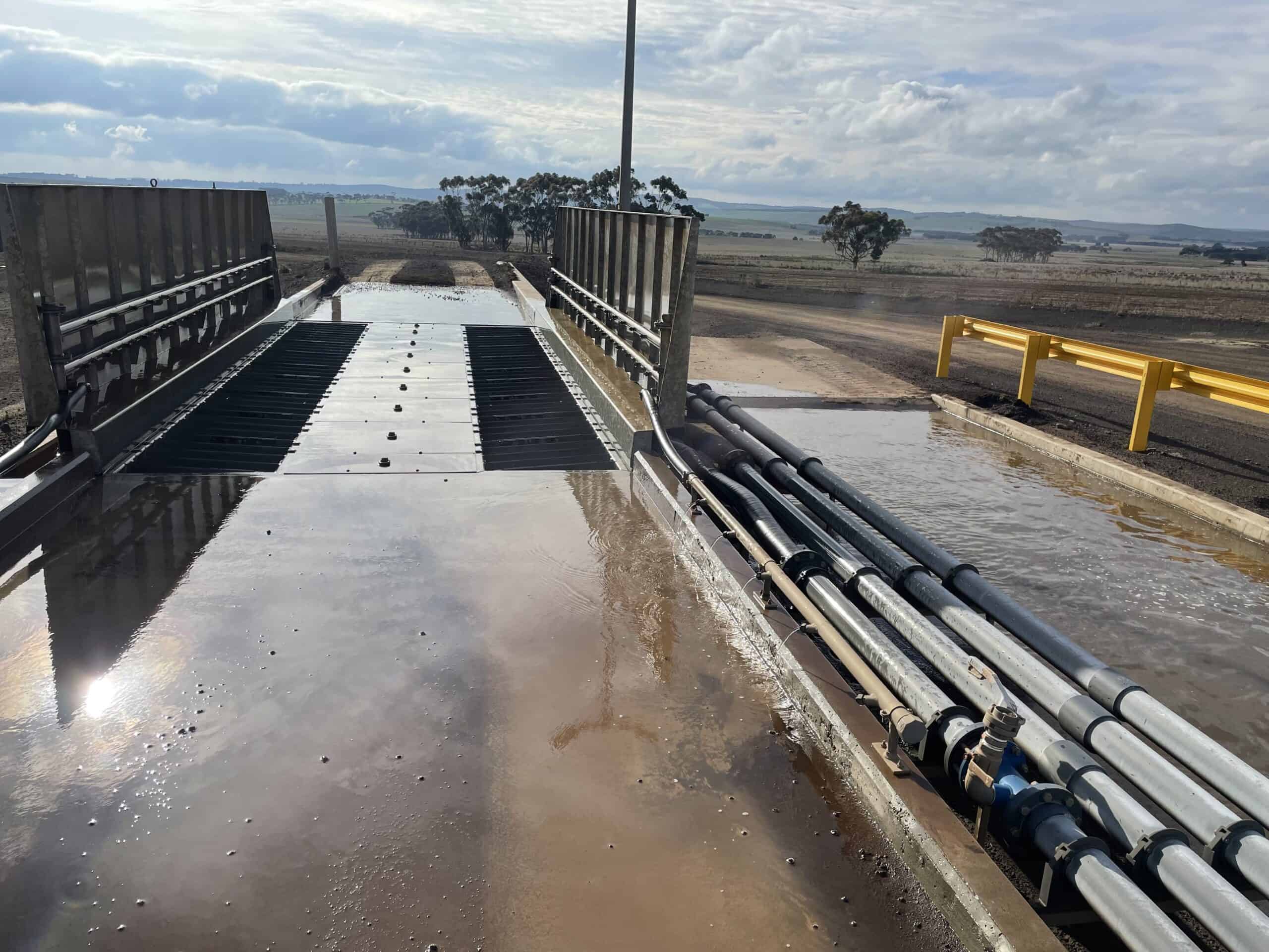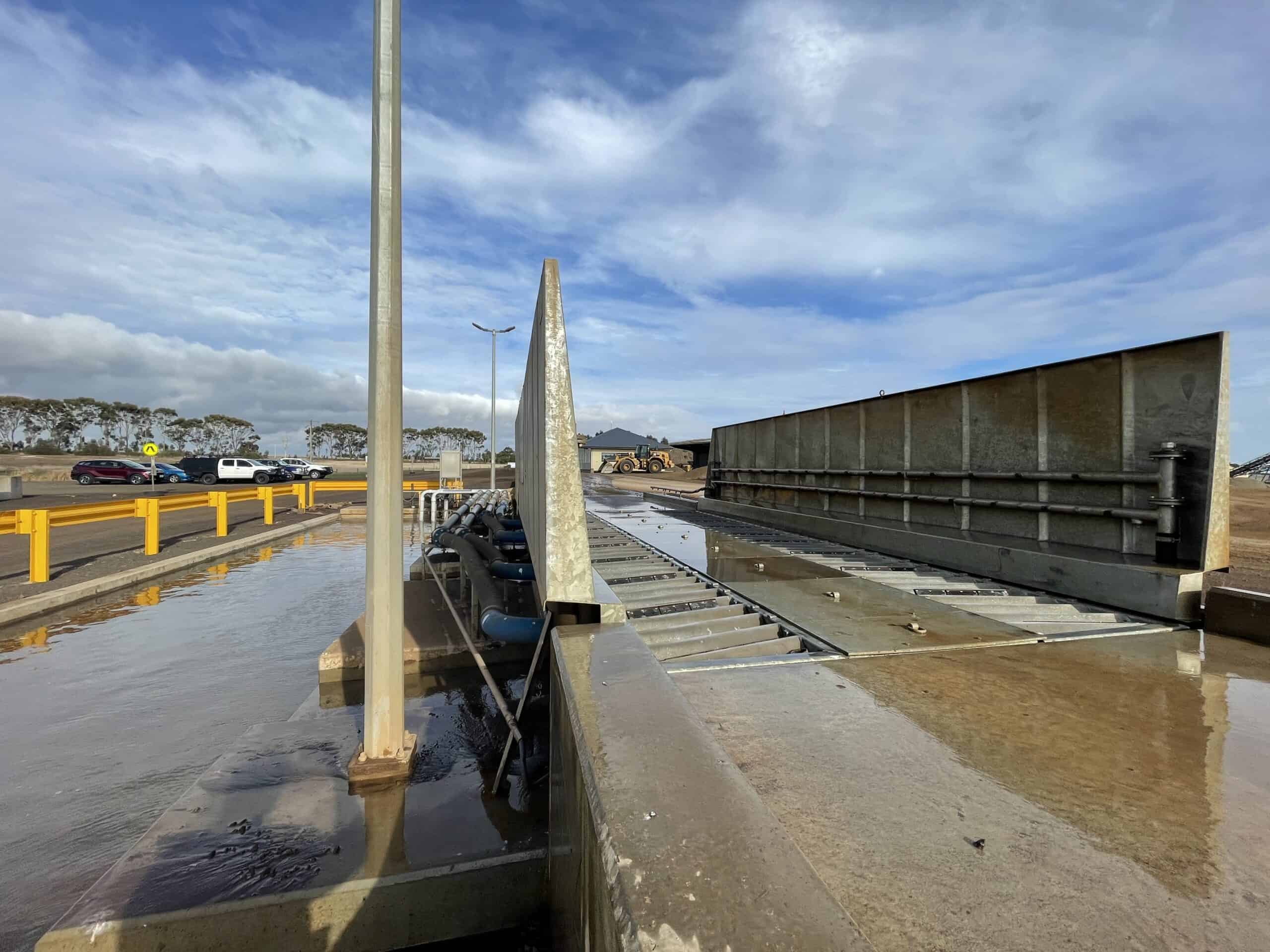 DESCRIPTION: Aqua Energy Group designed, supplied and installed the 7.2m long MobyONE from the MobyDick TailorMade Line. This robust system is completely hot-dip galvanised for reliability in a harsh mining environment. This system is fully automated and uses in-ground loop sensors to activate the system. Water drains into the adjacent concrete sump where it is recycled and reused using submersible pumps. The concrete weir prevents excessive solids from entering the intake of the pumps.
