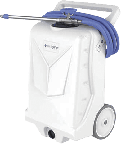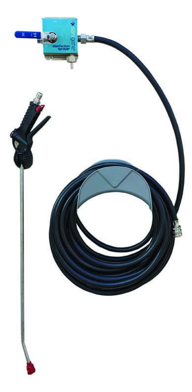 Wall mounted low volume industrial spray applicator for applying chemical solutions, ideal for vehicle and equipment disinfection. This disinfection sprayer is part of advanced disinfection equipment, utilising a venturi injection system that uses standard mains pressure (2.5-10 Bar) to draw and blend chemical concentrate into the water stream. Precision dilution is regulated by 12 dosing tips. The low volume of water in use makes it ideal for efficient disinfection.