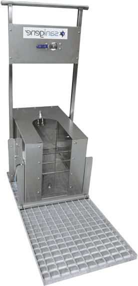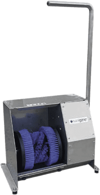 The workboot disinfecter & boot washer uses a system of brushes and a low-pressure water spray system with a built-in chemical mixer to clean boots from organic contaminants.