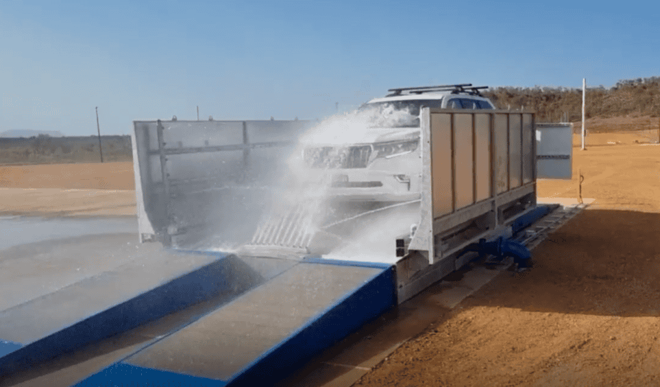 DESCRIPTION: Wash Systems Australia supplied and commissioned a 4m long automated wash system in Shoalwater Bay QLD. The wash system is a hot-dip galvanized, water carrying wash unit with splash protection side walls. The splash walls have triple nozzle bars (4m long) on both sides made from galvanized steel. Each nozzle is 7mm in diameter and works on an oscillating function with low-pressure, high-volume output. This system was designed to wash up to 150 vehicles (15 tonne axle load) over a 10-hour shift.